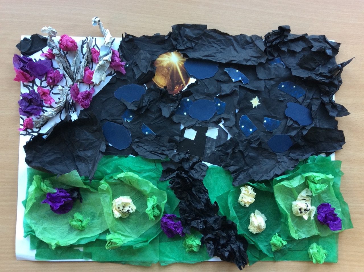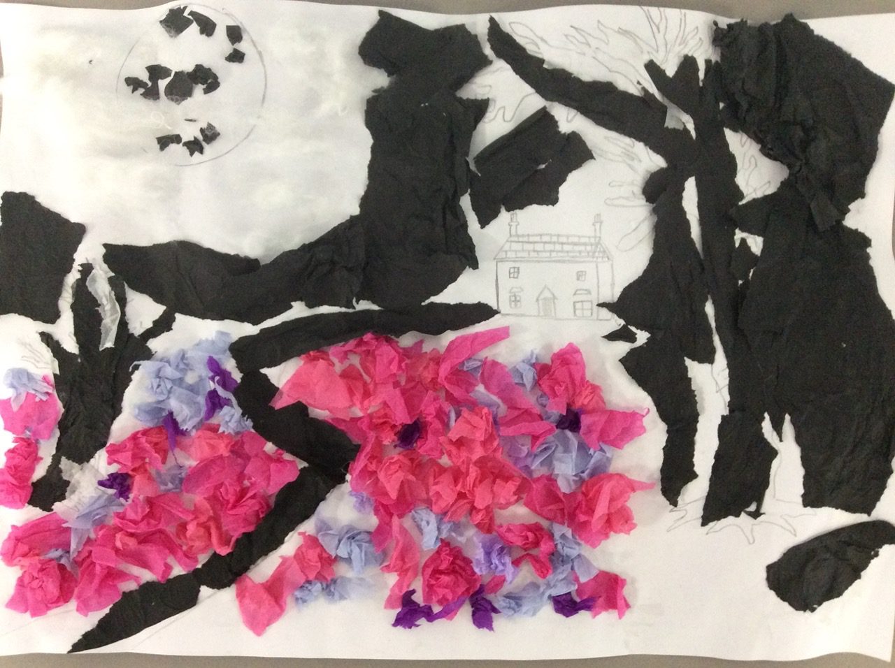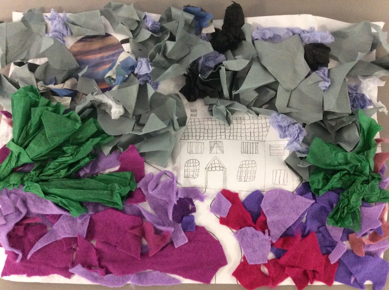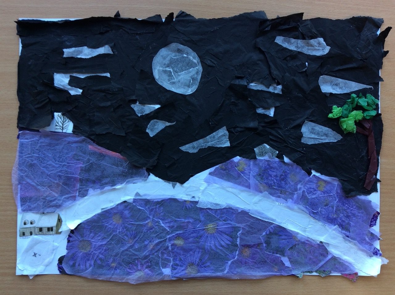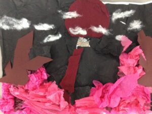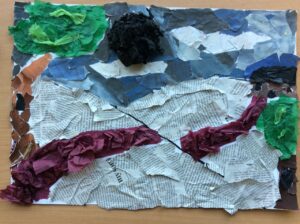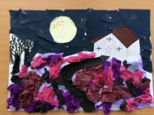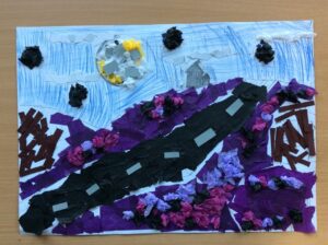 “The road was a ribbon of moonlight over the purple moor, And the highwayman came riding—Riding—riding— The highwayman came riding, up to the old inn-door.” Year 5 created a setting collage to capture the mood and atmosphere in the poem, The Highwayman. We used sensory details to guide our collage choices, considering the poem’s description of the moon, moor and inn. “The wind was a torrent of darkness among the gusty trees, The moon was a ghostly galleon tossed upon cloudy seas…”